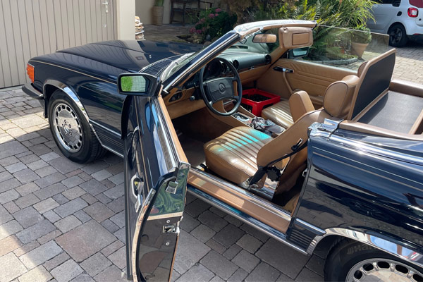 Mercedes SL 560. Unter normalen Umständen braucht man dazu ohnehin nichts zu sagen. Da dieser Mercedes SL 560 aber so unfassbar schön daherkommt, müssen einige Worte fließen. Die Farbkombination aus dem extrem dunklen Blau mit dem beigen Interieur verdient ein lautes: WOW. Lack, Chrom und Accessoires zeigen sich in bestem Zustand. Die vergangenen 35 Jahre sind spurlos an dem Kraftprotz vorbei gegangen. Dabei zeigen sich auch der Motorblock, Automatik sowie die zahlreichen Extras von ihrer besten Seite. Als einer der letzten seiner Baureihe spielen Premiere-Fehler hier keine Rolle. Alles funktioniert, wie die Stuttgarter es in den späten Achtzigern planten. Und das die nachhaltig planen können, wissen wir nun um so mehr.